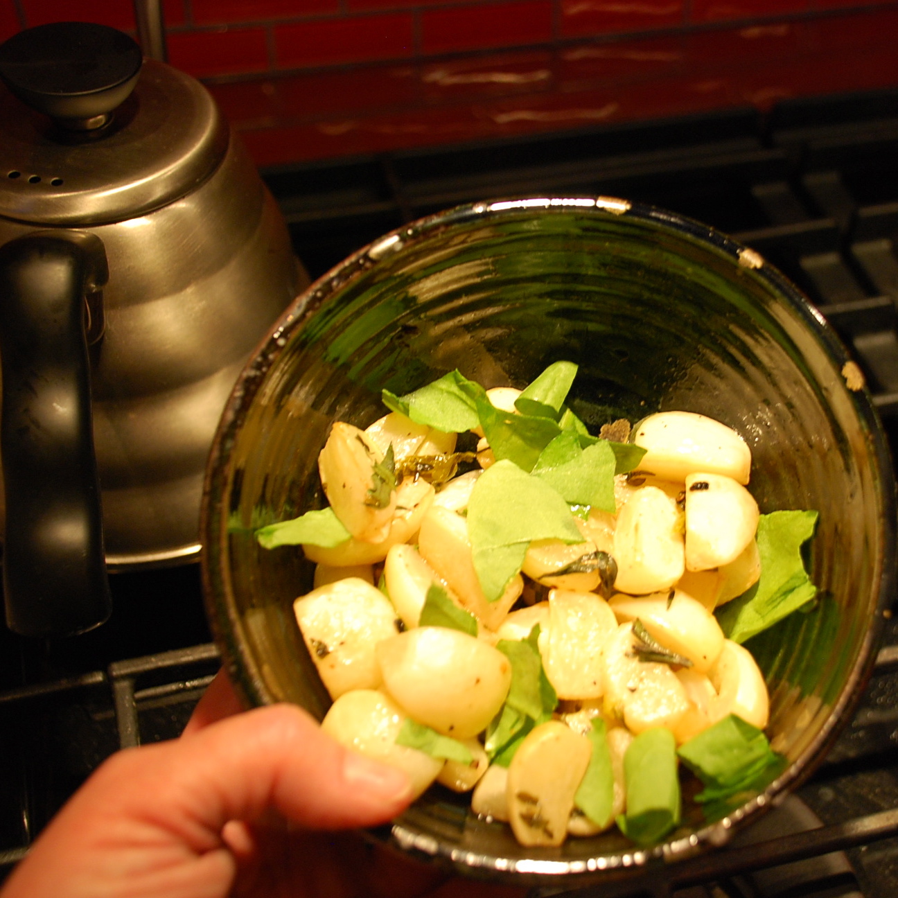 Lots of gorgeous green things in my half-share today – spinach, kale, lettuce, bok choy and more – but what caught my eye immediately was this bunch of White Beauty radishes. Perfect for braising.