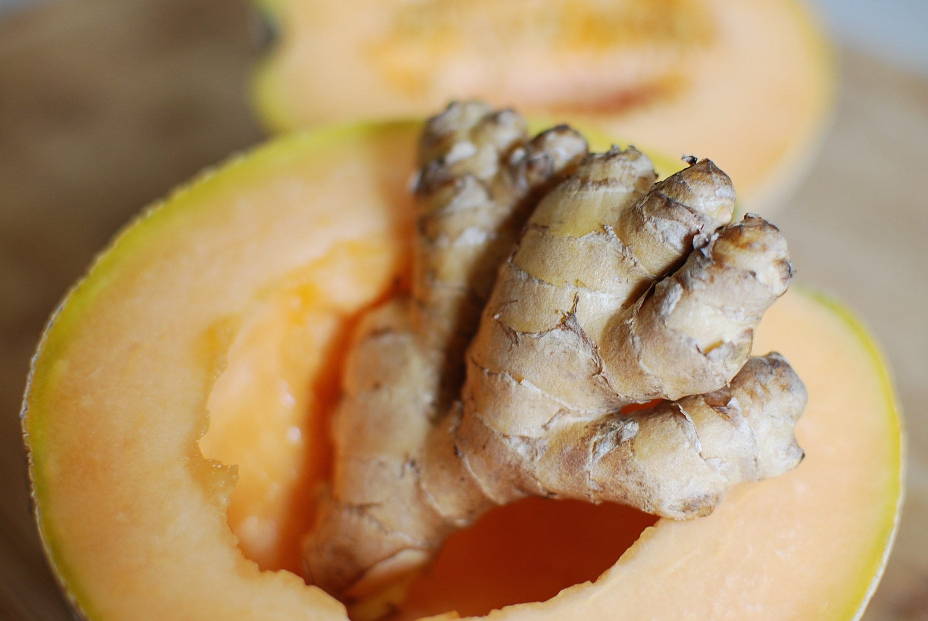 I hadn’t thought much about that table until the other day. A few straight weeks of melon-laden fruit shares had backed up on us, and I was flipping through my well-stained copy of Food in Jars for inspiration. I’d made a peach-basil-chicken stew with fresh ginger the day before—and still had half-a-hand on hand—so when I saw Marisa’s cantaloupe jam, I knew had to give the mash-up a go.