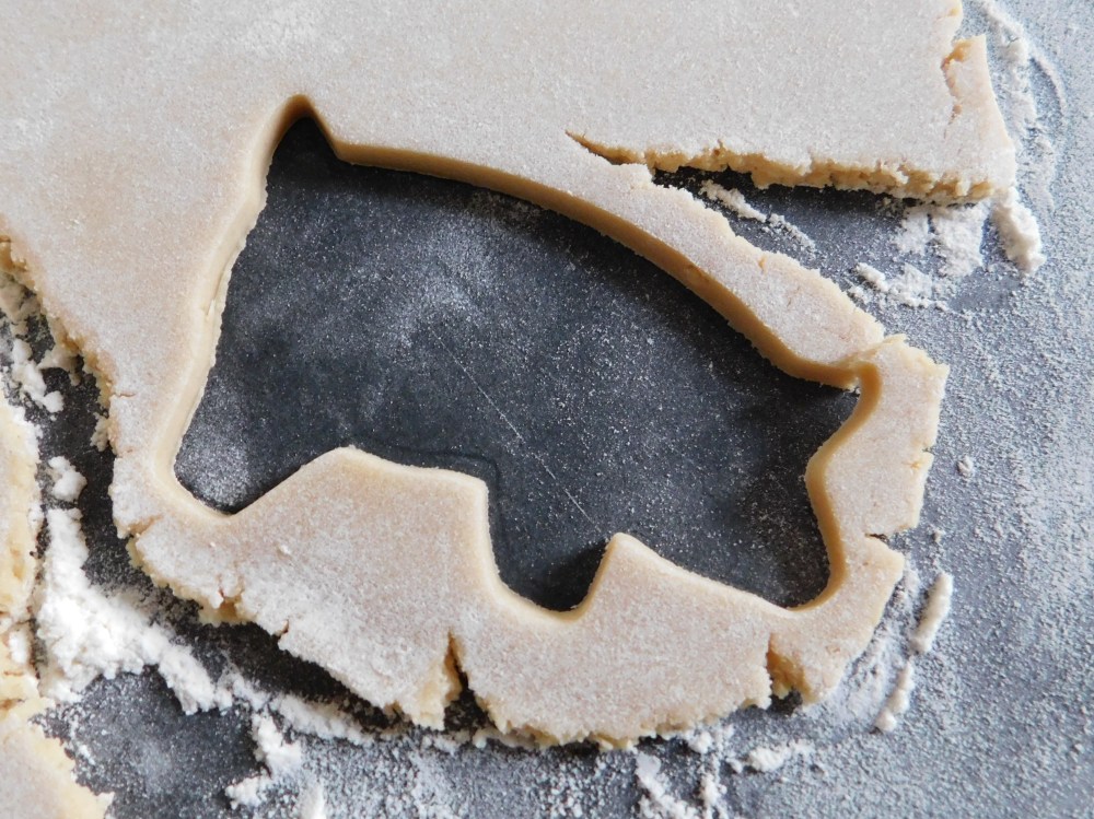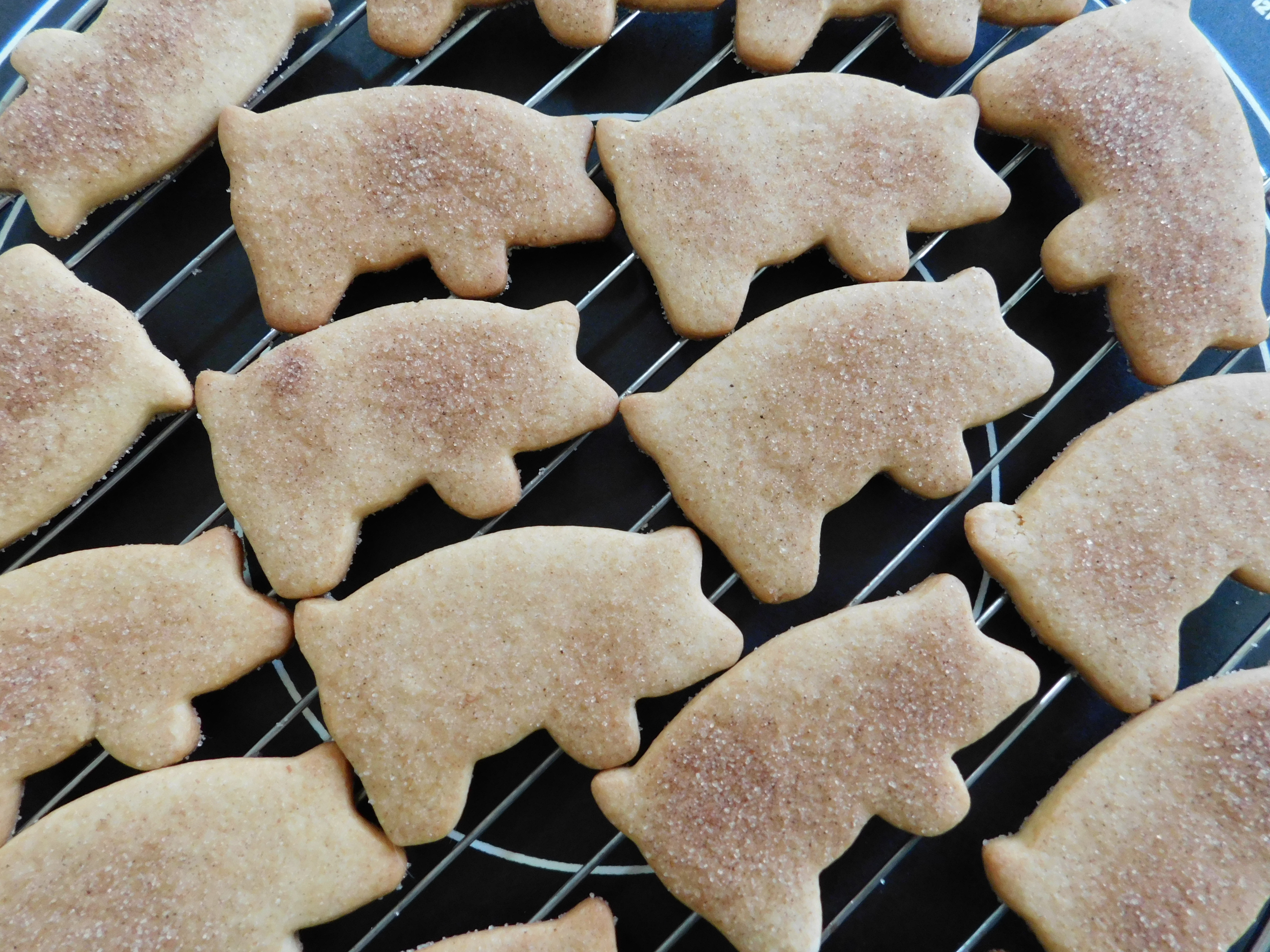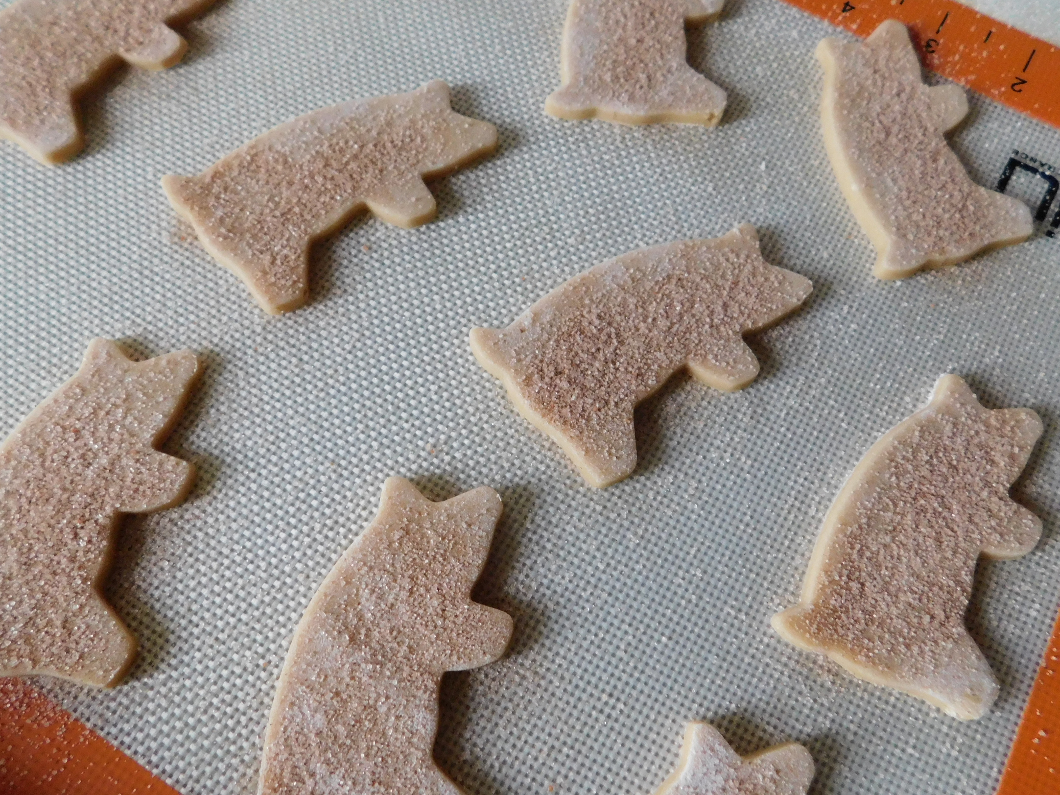 Roll out the first disk on a lightly floured surface. Cut out the piggies (or your favorite shape) and use a spatula to transfer them to the baking sheet, keeping a good inch margin around each cookie. Bundle and re-roll the scraps till you fill the first pan. If the dough gets sticky and soft, re-chill it for a few minutes before you resume.