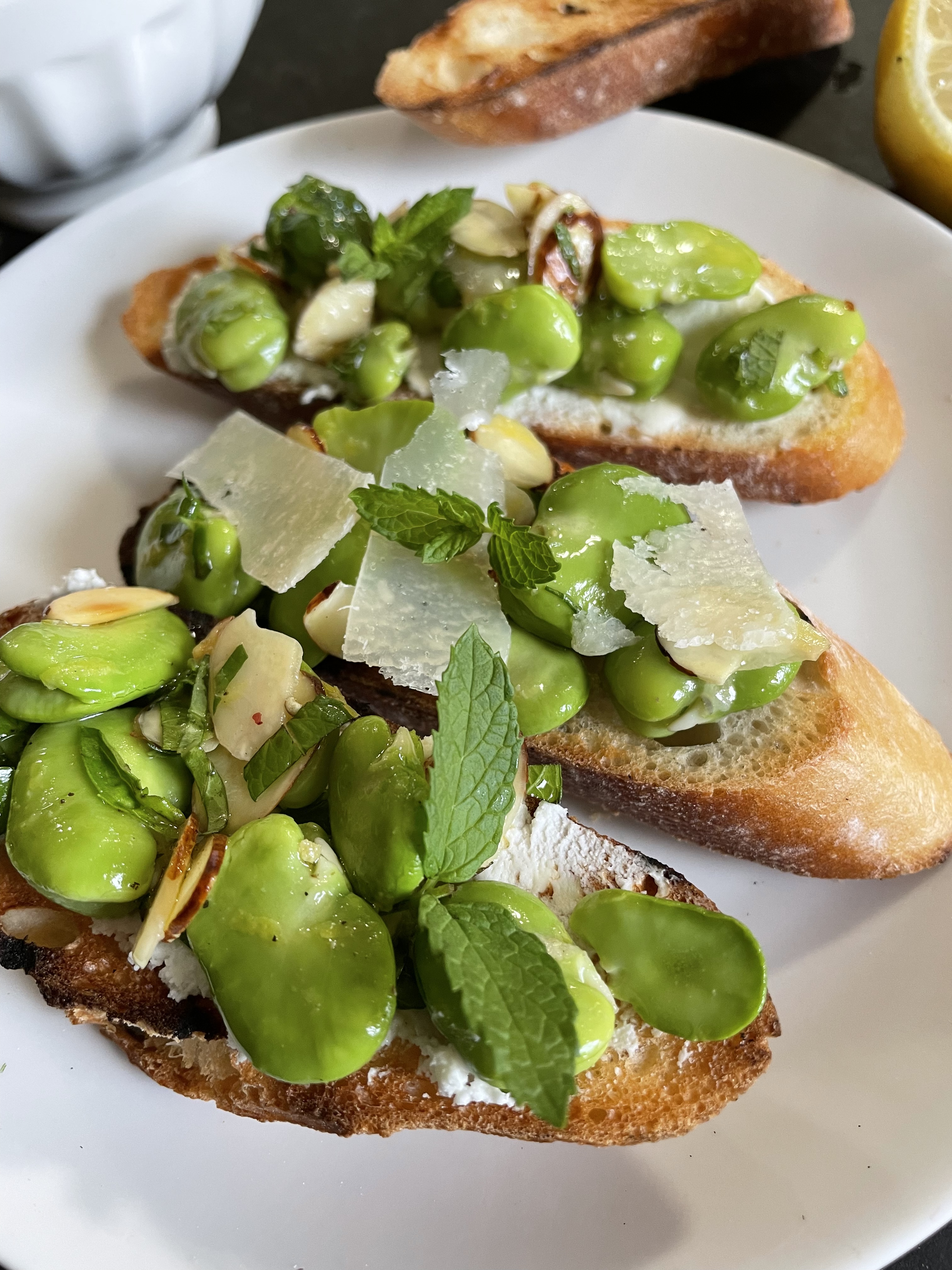 No favas? No problem. I do pretty much the same thing with English shelling peas, using a two-minute blanch and shock before I smash them with a fork. Edamame (soy beans) work great, too.