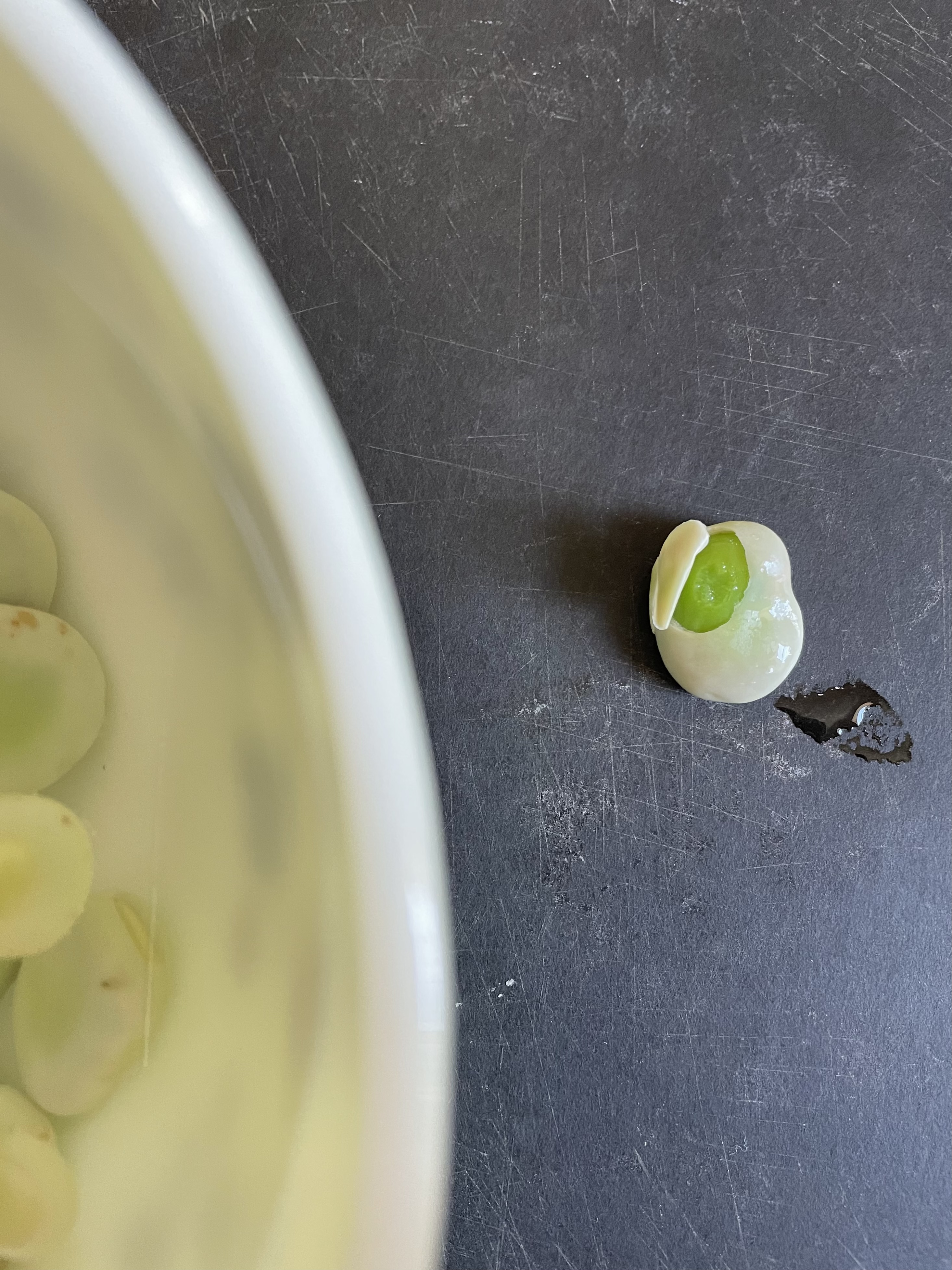Bring a large pot of water to boil, and load a large bowl with ice and a bit of water. Add the beans to the pot and cook for three minutes. Using a spider or slotted spoon, transfer the beans to the ice bath. Once they’re cool enough to handle, gently squeeze each bean from its outer skin. Discard the skins, and put the beans into a small mixing bowl.